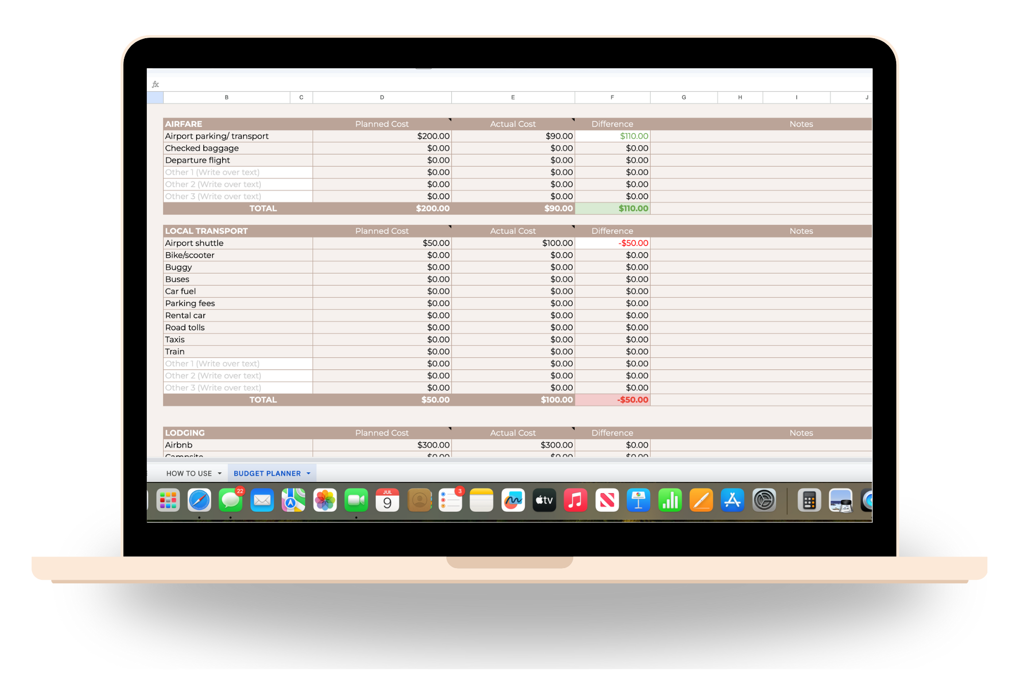 Side-by-side columns to track Planned, Actual, and Difference