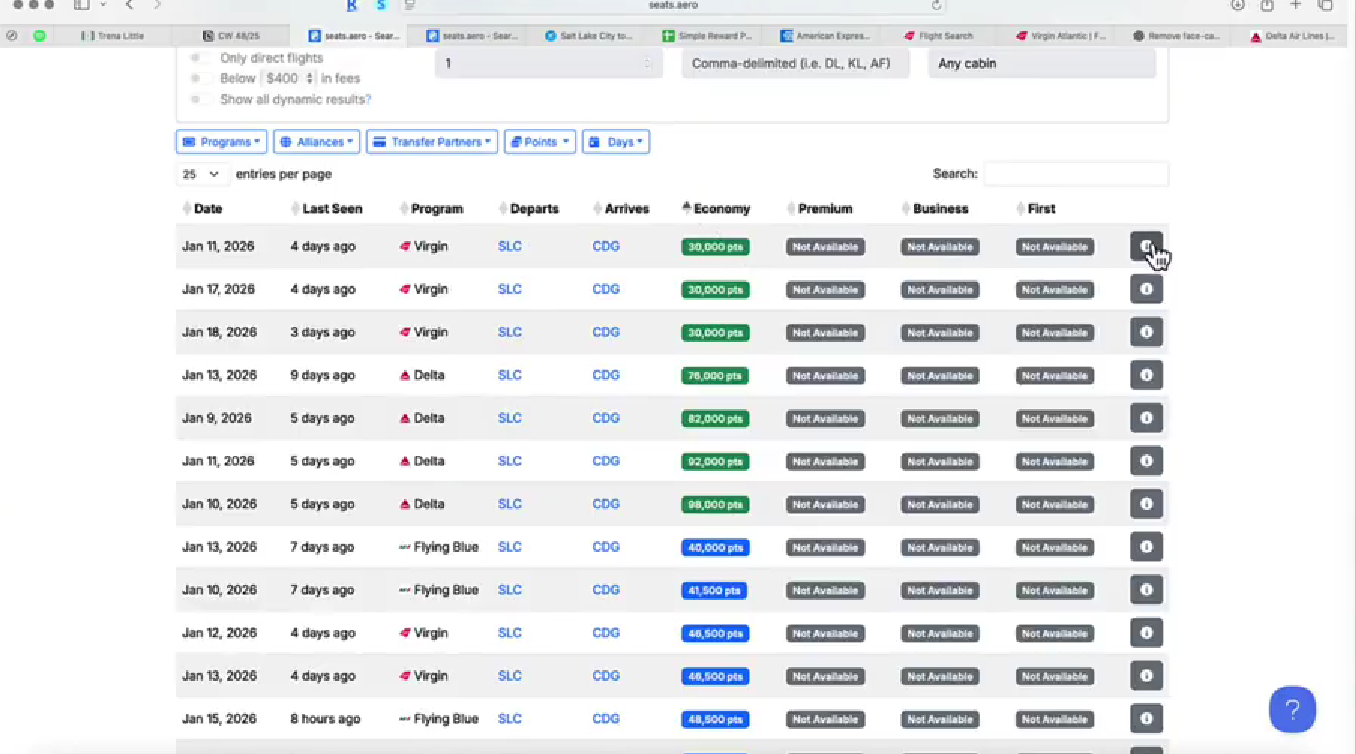 Instead of booking with cash, I move to an award search tool that shows flights available with points.