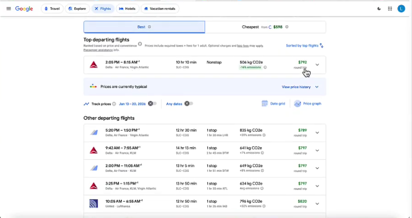 For this example, I searched a round-trip flight from Salt Lake City to Paris in January. The result?